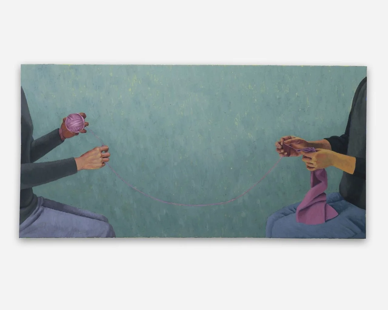 Rebecca Wu, Let's Unravel the Sweater, 2025. Oil on Canvas, 24 × 48 inches. Courtesy of the Artist and Make Room Gallery.