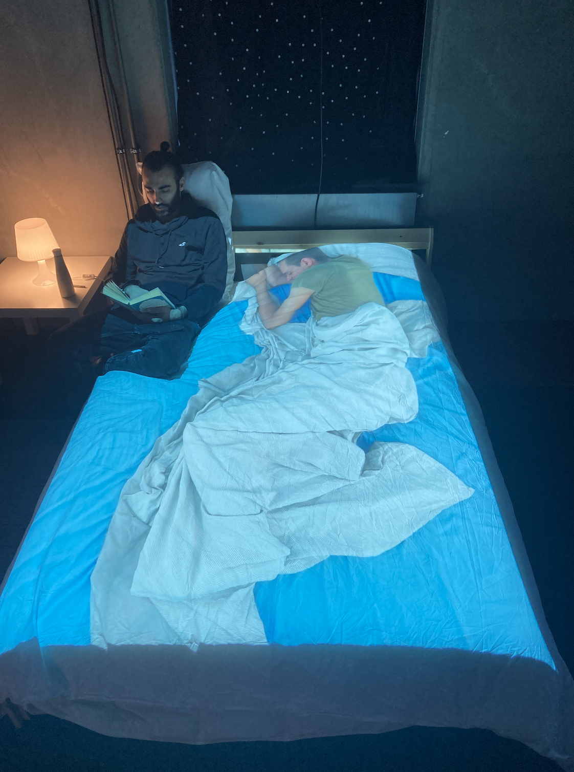 Together with mentor Emeka Ogbah, he presents a multimedia installation that smells so enticing that all the visitors leave hungry with a lingering memory of fragrant sauce and warm, toasted spices. His performers Oudai Amer, Kimia Bani, and Jaqee Nakiri mill about the installation, quietly inhabiting a domestic set that feels so familiar and so inviting that we nearly have to stop ourselves short of climbing into bed with them.