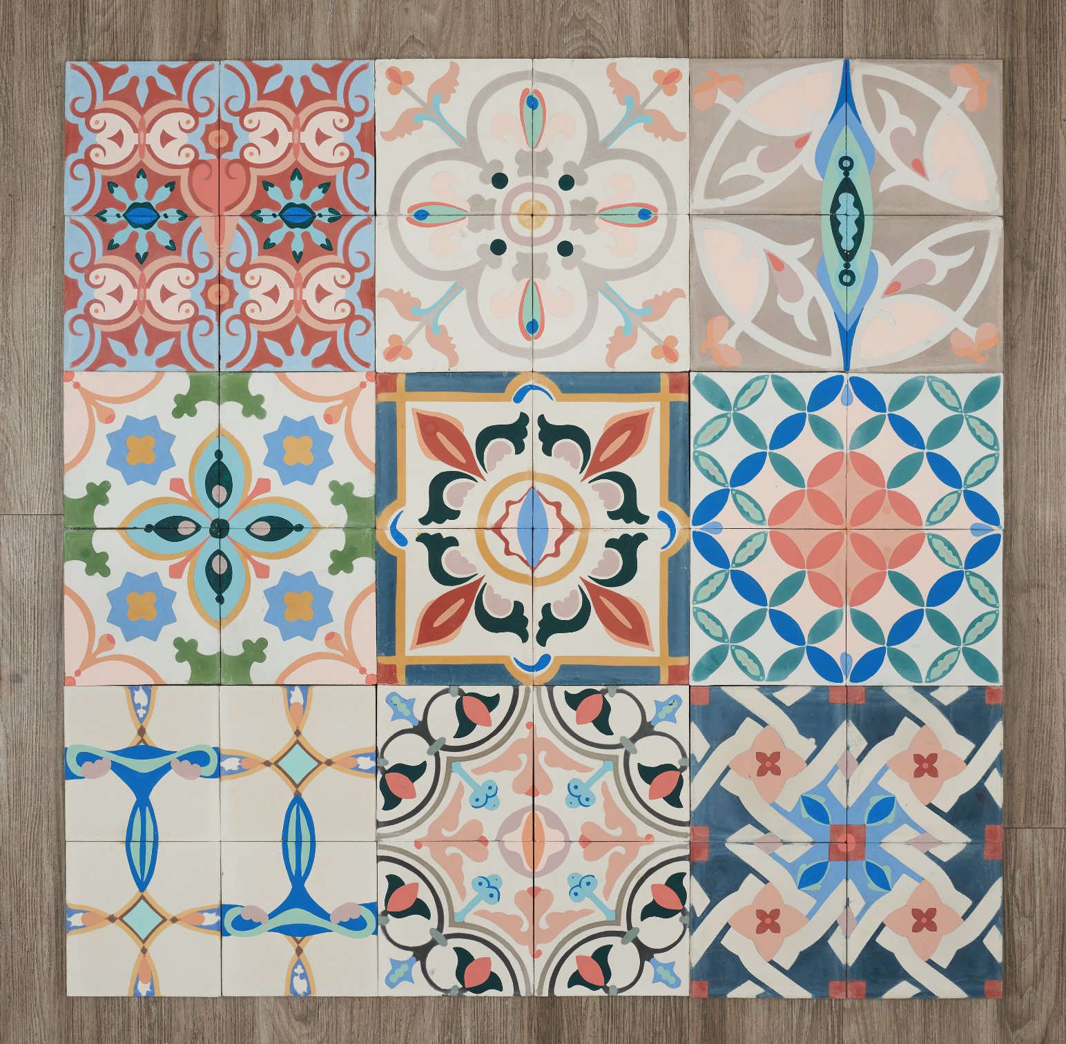 Mariana Gómez, Fallopian Tubes and Grandmother’s Desserts series. Installation of intervened hydraulic tiles, dimensions variable.