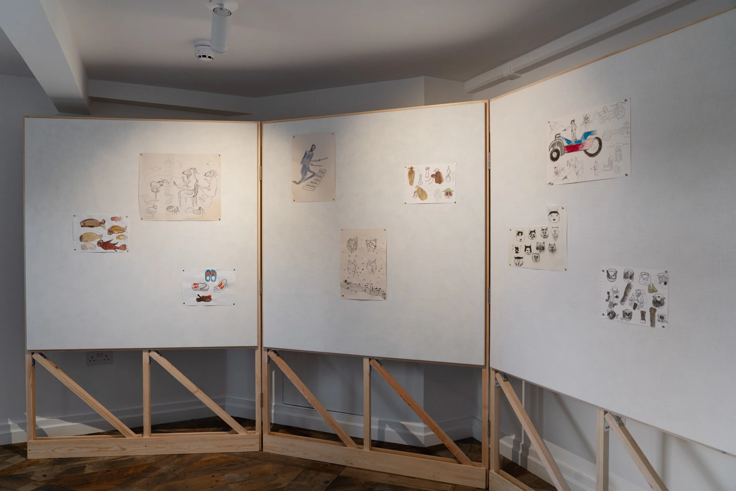 A small adjoining room contains twelve preparatory sketches, which clarify the internal mechanics of the project. They highlight the secondary characters and motifs that operate like cameos or narrative tools. Seen together, the sketches emphasise that the narrative is constructed rather than simply told. They act as hints, clues embedded in the story’s logic.