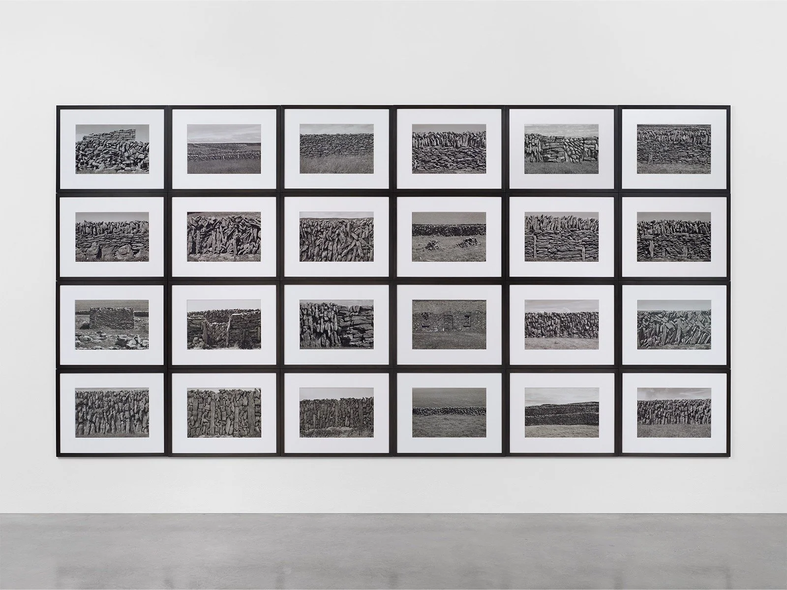 Next are images of Moroccan walls and Sienese doors, revealing the structural affinities between Scully’s painted works and the built environment. The 2005 Aran series of 24 black-and-white photographs, taken on the island off the west coast of Ireland, is exhibited nearby, and two large-scale paintings complete the presentation. A classic five-banded Landline stretches across the gallery with weight and deliberation. Its horizontal strands feel geological, as though sedimented over time.