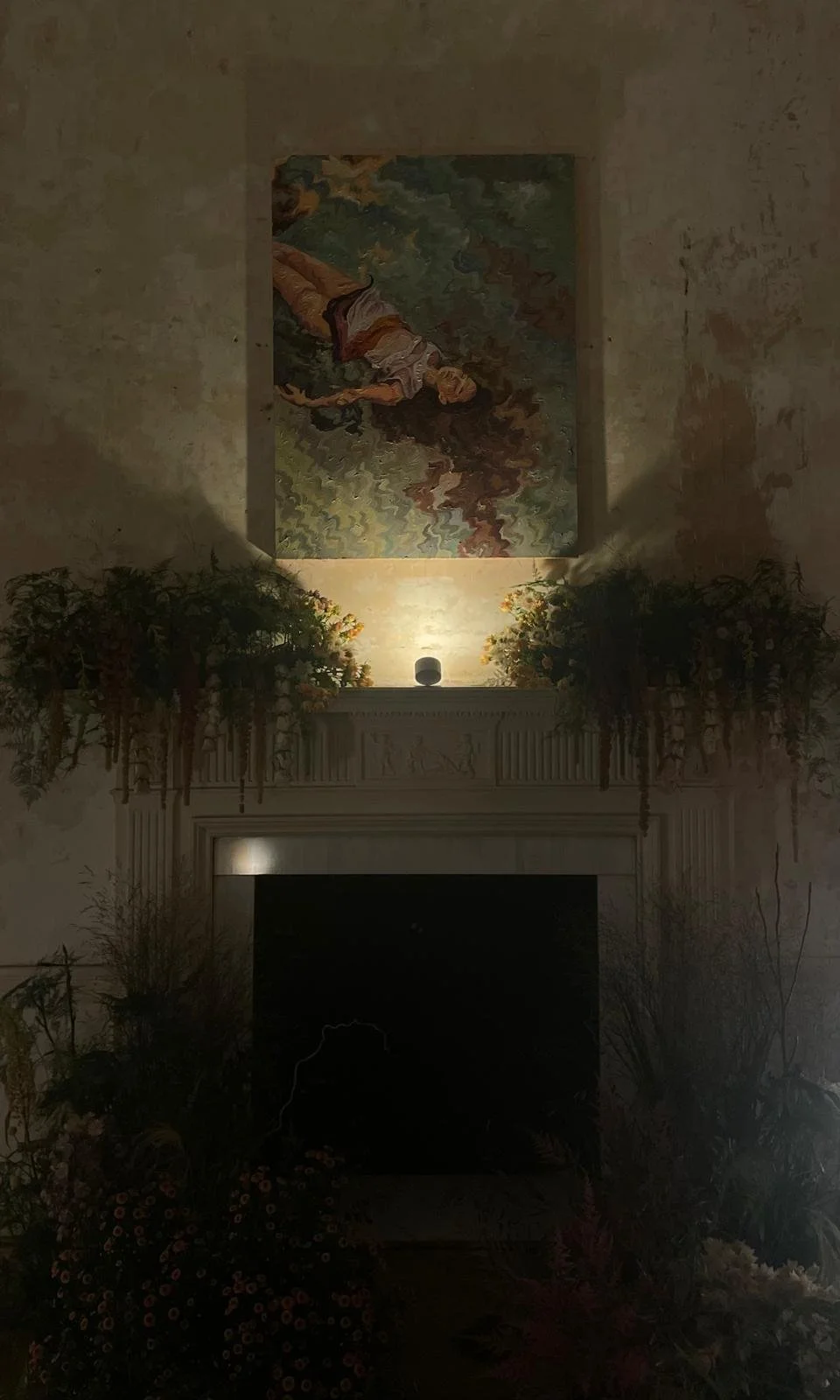 That duality finds a visual echo in the setting. The soft curves of her painted forms seem to breathe against the tidy linearity of the Georgian interior. Beneath high ceilings adorned with delicate plasterwork, the paintings ripple with energy, breaking away from the orderliness of their surroundings. Yet they harmonise with the space in subtler ways—the ornate cornices, the warm glow of the walls, the gentle light filtering through tall sash windows. Dried flower arrangements, scattered thoughtfully throughout, recall a summer passed. Their muted oranges and soft pinks conjure the fading warmth of an evening garden, as the gentle pluck of a harp drifts through the rooms, completing the atmosphere of tender reverie.